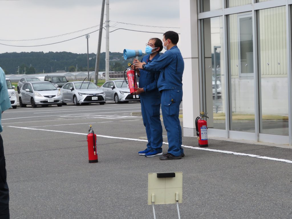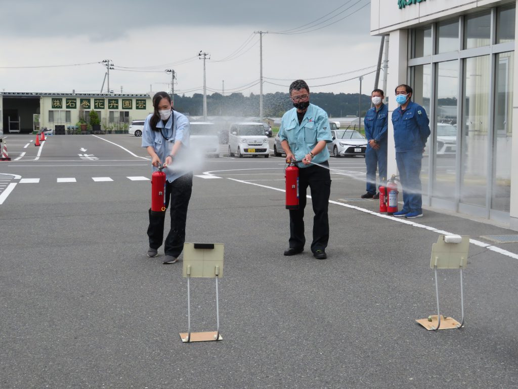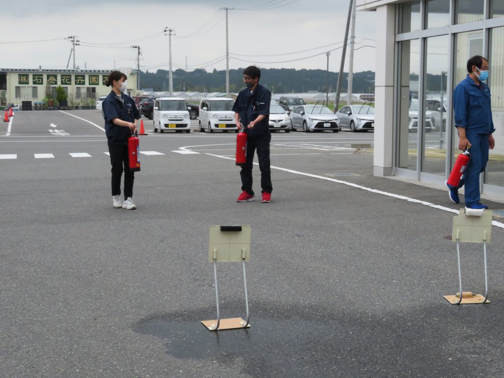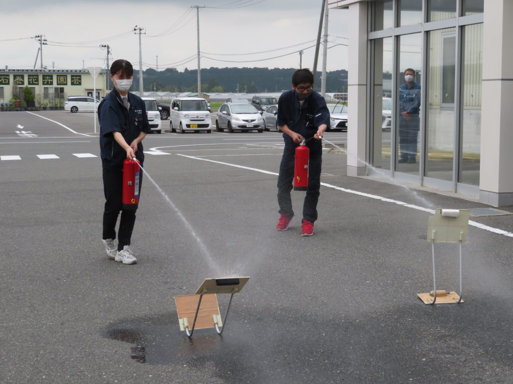 消火訓練はあいのや本部さんから1名、当社にて研修中のJA新みやぎさんから1名、石巻青果新入社員2名で行いました