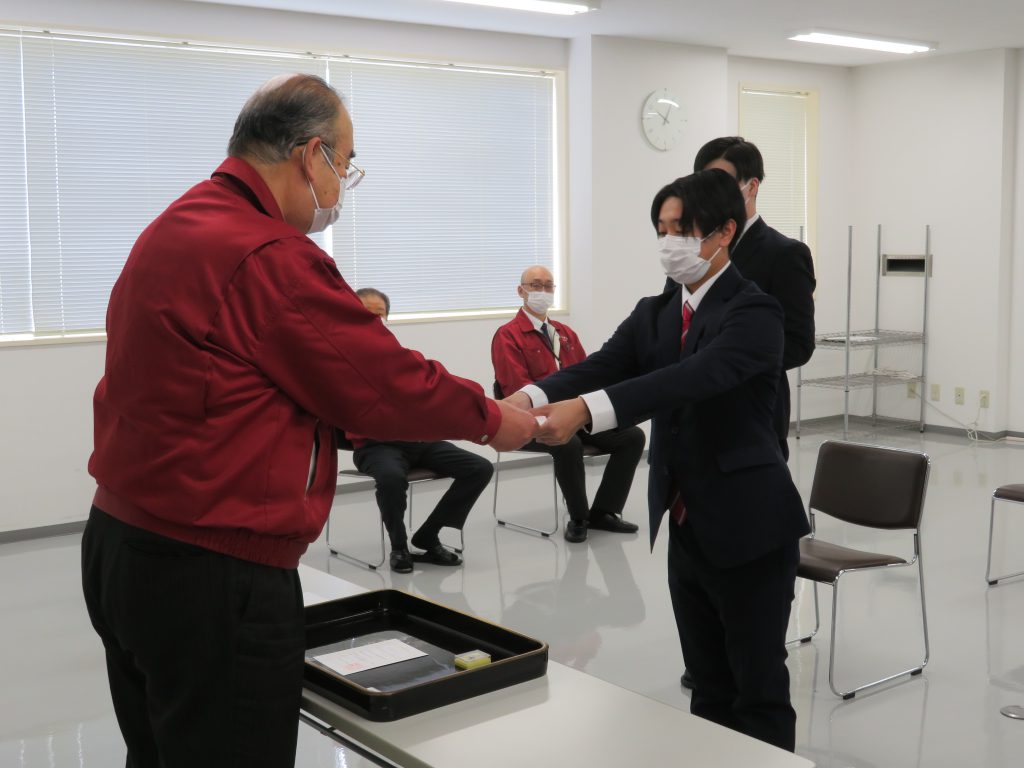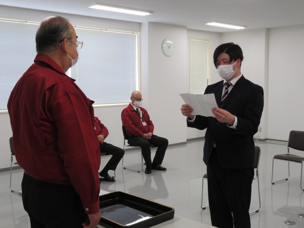 新入社員は緊張した面持ちの中、辞令交付で名前を呼ばれるとしっかりとした返事をし、これから始まる社会人生活への意気込みが感じられました