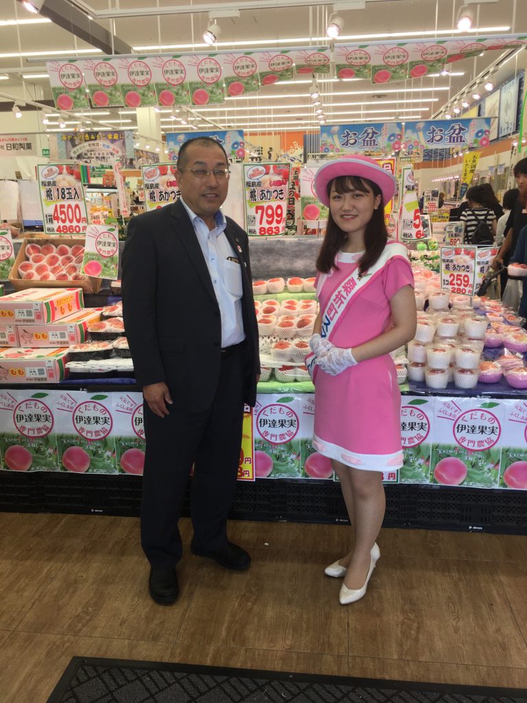 福島県より 伊達果実農協様と桑折町スマイルピーチ様が来石され、本日7月27日あいのや のぞみ野店様・大街道店様にて試食販売を行っています!